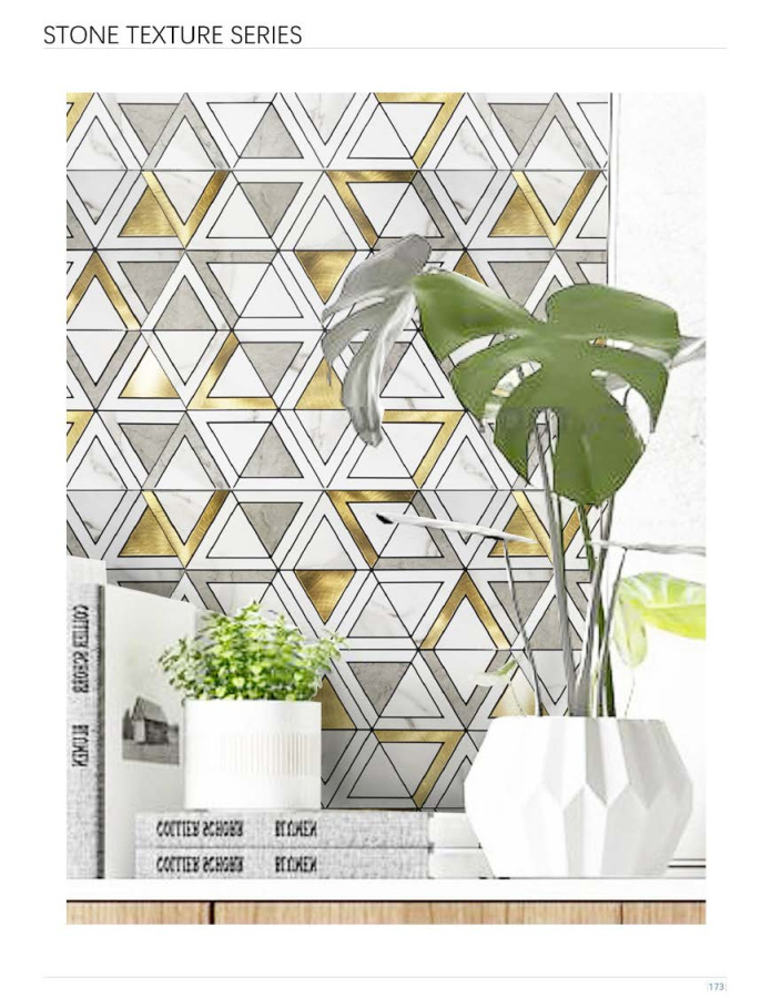 Designed for DIY enthusiasts and lovers of artistic, high - end decor, these peel - and - stick mosaics blend an intricate geometric triangular - patchwork layout, marble - like textures, and luxurious metallic (gold) accents—perfect for upgrading walls, backsplashes, or feature areas in homes, hotels, upscale restaurants, or any space craving a unique, elegant aesthetic.