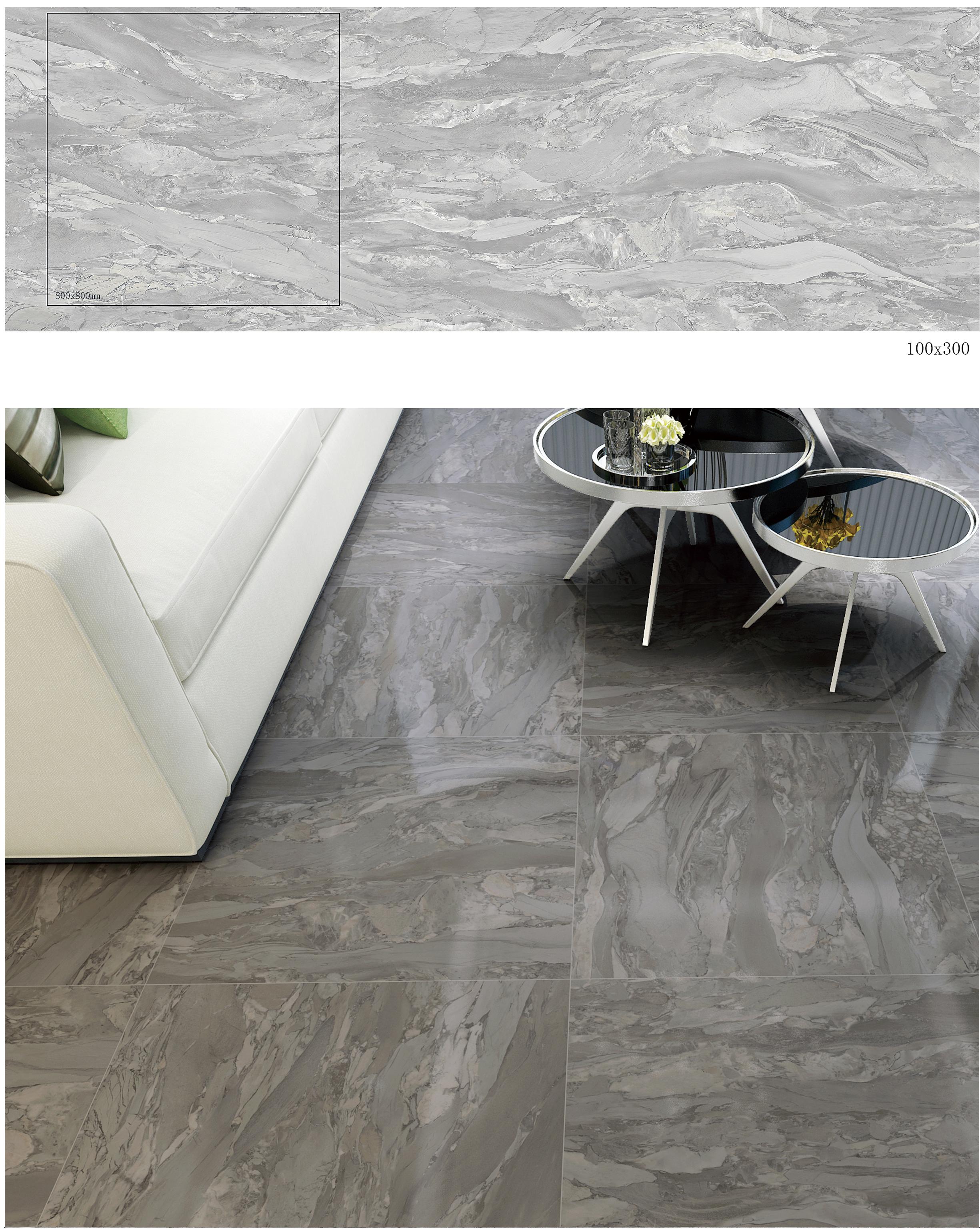 These grey marble - patterned tiles come in two sizes, 100x300mm and 800x800mm, from the Grey Marble Pattern series. Featuring natural flowing marble veins, they bring an elegant and dynamic aesthetic to living rooms, bedrooms, and other interior spaces. With their versatile sizing and striking grey marble pattern, these tiles are perfect for creating a stylish and sophisticated look in any interior design project, adding a touch of natural beauty and luxury.