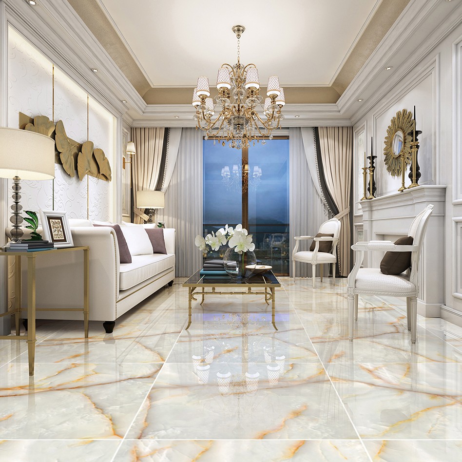 These white onyx - look tiles with gold veins, available in multiple sizes and part of the White Gold Vein Luxury Onyx series, feature a stunning onyx - like pattern interwoven with elegant gold veins. They exude an extraordinary sense of luxury and sophistication, making them an ideal choice for living rooms and high - end interior design projects. These tiles bring a touch of grandeur and visual appeal, creating a stylish and inviting ambiance that is truly one - of - a - kind.