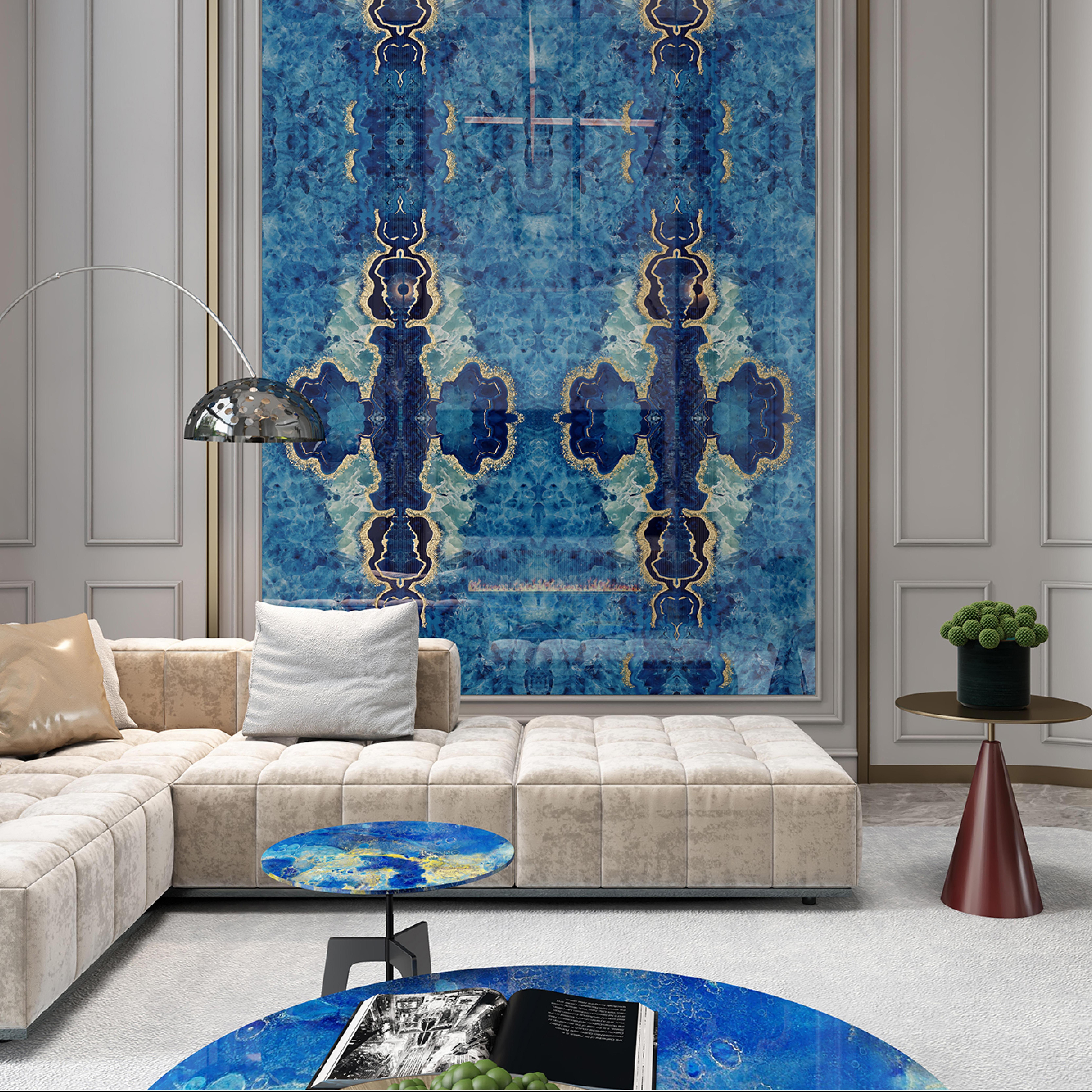 The symmetrical, artistic patterns blend rich blue tones with gold accents and white highlights. With a glossy finish that amplifies color richness and pattern depth, they transform living room feature walls into luxurious focal points, adding an artistic, high - end touch to interior spaces.