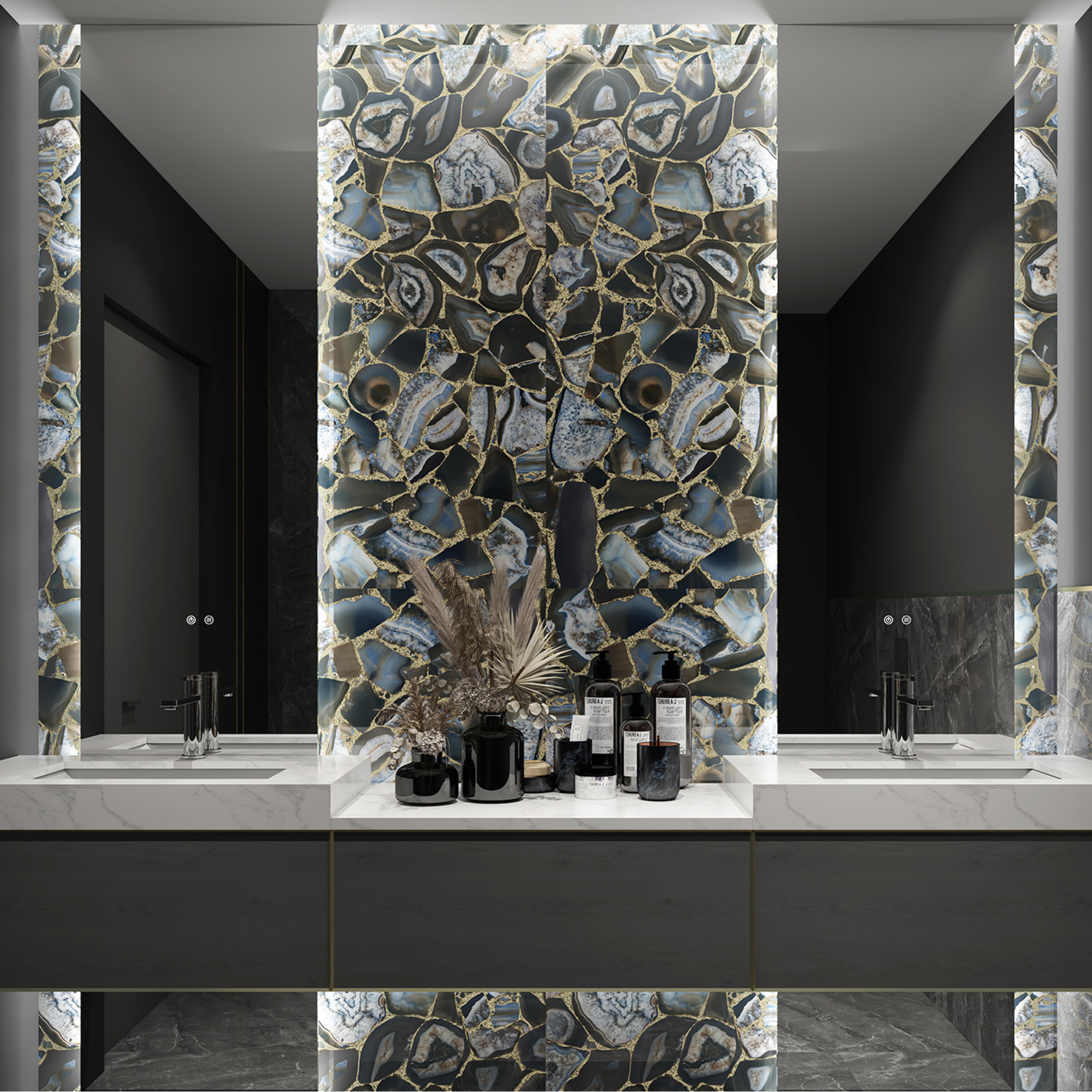 Mimicking the organic beauty of agate slices, the intricate pattern blends natural tones with gold accents. With a glossy finish that amplifies the stone - like shimmer, they transform bathroom feature walls into luxurious focal points, adding an artistic, nature - inspired touch to high - end interior spaces.
