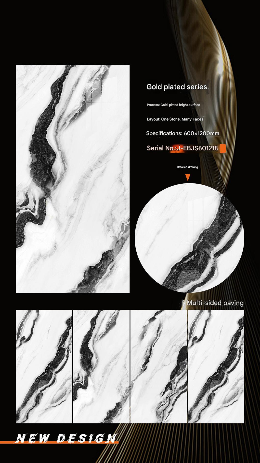 This ceramic tile, sized 600x1200mm, comes with a gold - plated bright surface and a black - white marble - look design, adopting a “One Stone, Many Faces” layout. It's perfect for creating a high - end, artistic ambiance in interior spaces.