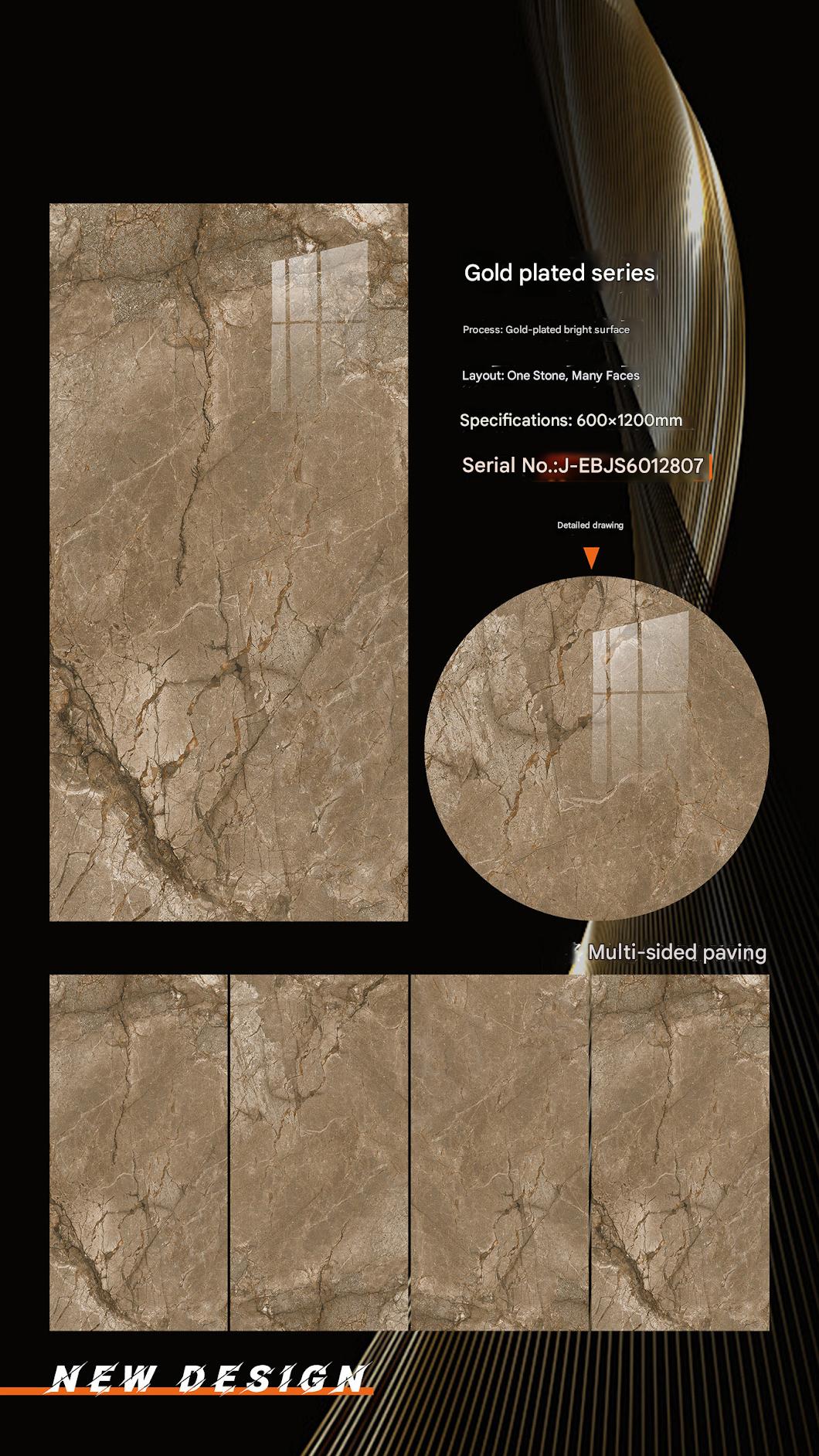 These 600x1200mm ceramic tiles from the Gold Plated Series feature a gold - plated bright surface and a brown marble - look design with a “One Stone, Many Faces” layout. They are ideal for interior decoration, bringing a warm and luxurious touch to any space with their rich brown tones and glossy finish.