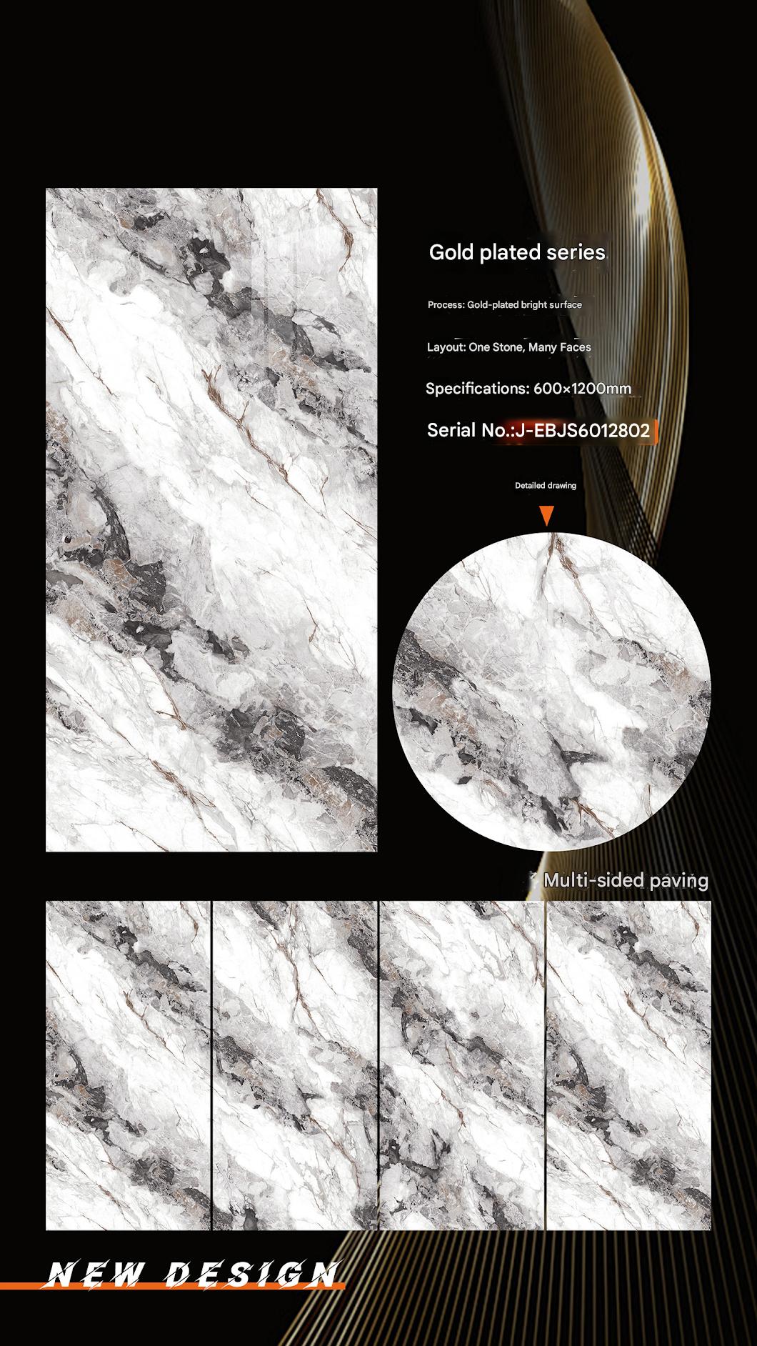 This ceramic tile, sized 600x1200mm, belongs to the Gold Plated Series. It has a gold - plated bright surface and a grey - white marble - look design with a “One Stone, Many Faces” layout. Perfect for interior decoration, it can bring a sense of luxury and natural beauty to any space.