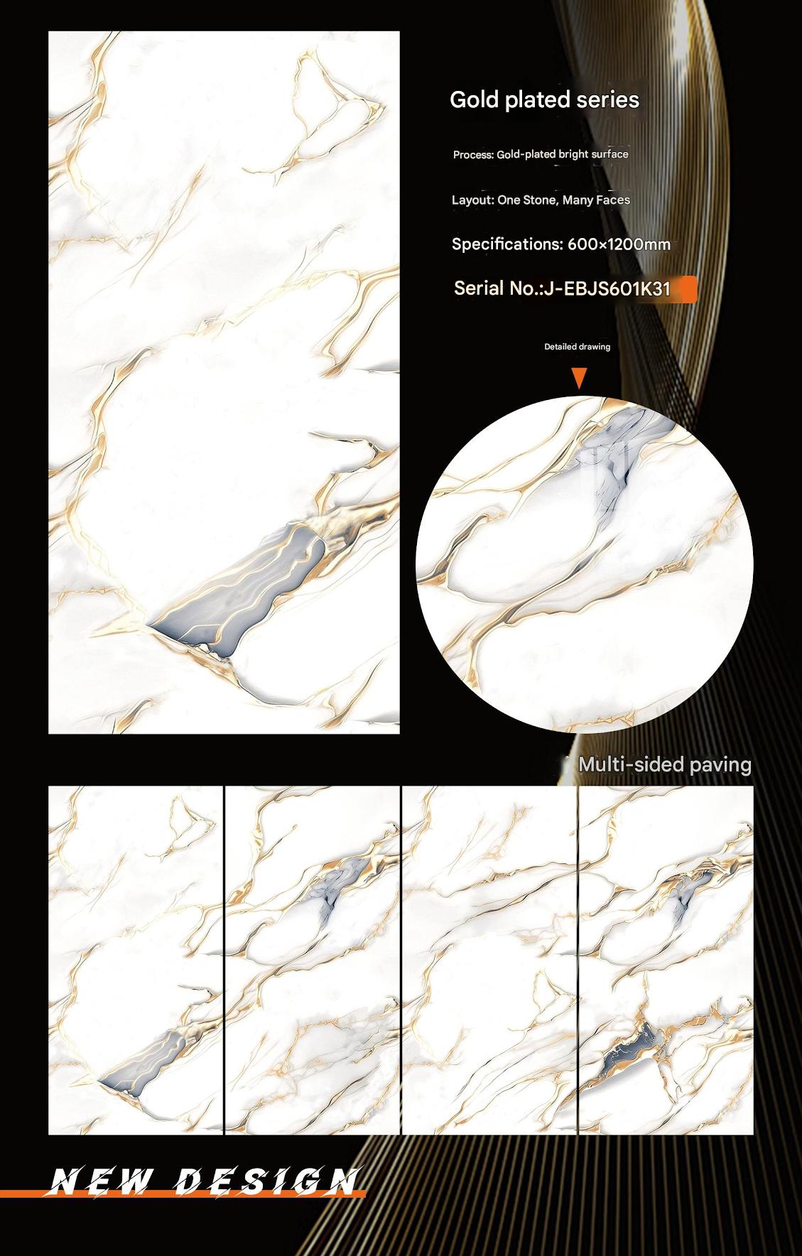 This ceramic tile, sized 600x1200mm, features a gold - plated bright surface and a white marble - look design with a “One Stone, Many Faces” layout. It's perfect for adding a luxurious and elegant touch to interior spaces.