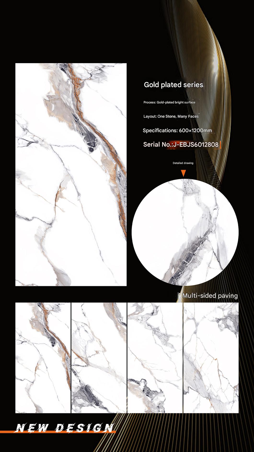 These 600x1200mm ceramic tiles from the Gold Plated Series feature a gold - plated bright surface, a white marble - look design with striking gold veins, and a “One Stone, Many Faces” layout. They are perfect for interior decoration, adding a touch of luxury and elegance to any space with their unique and glamorous appearance.
