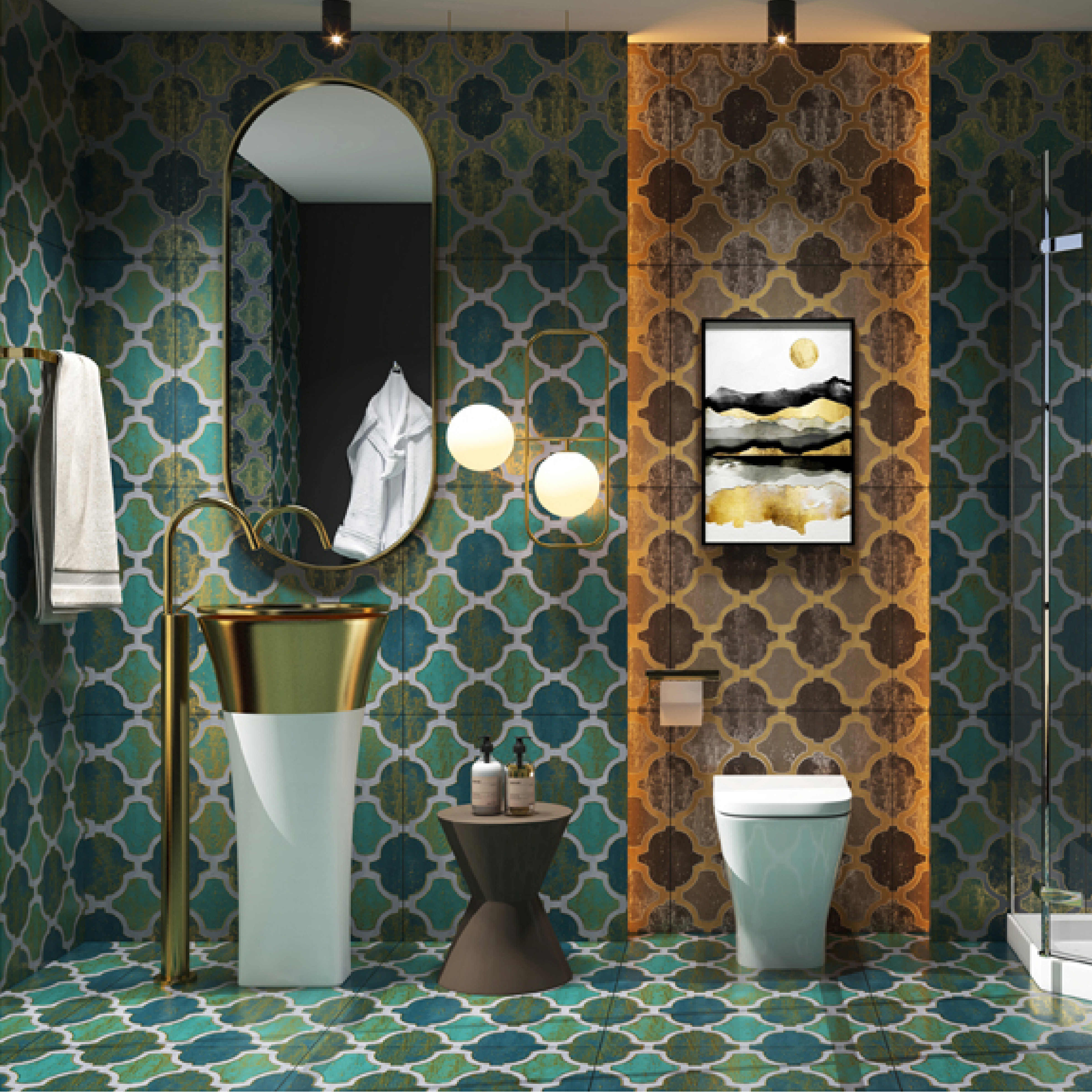 These 600x600mm ceramic tiles feature a blue - green geometric pattern with a vintage Moroccan - style design. Ideal for kitchen decor, they add a retro, exotic flair to floors and walls, blending artistic charm with durable functionality for a unique culinary space transformation.