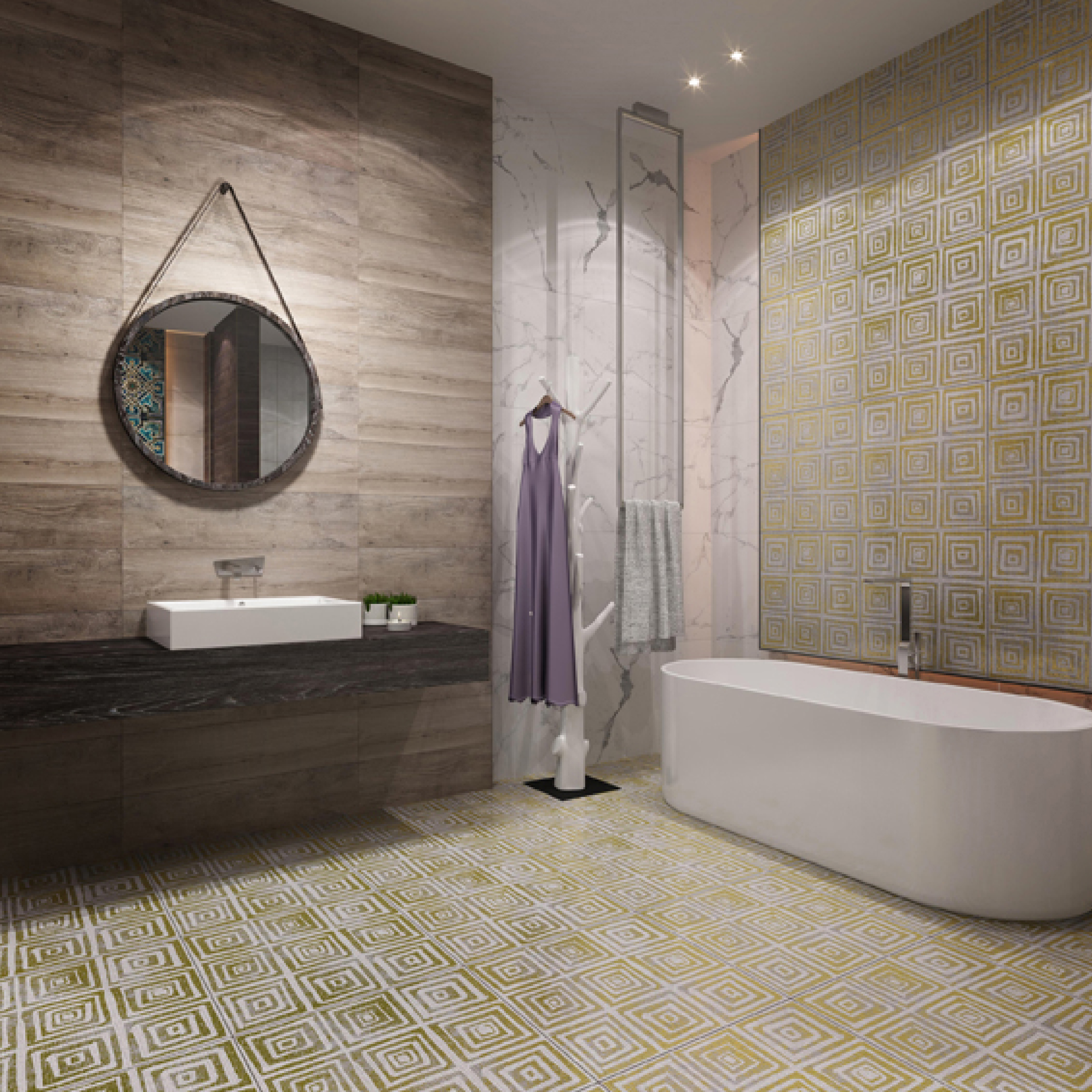 These 600x600mm ceramic tiles feature a sleek green - white geometric pattern, perfect for modern kitchen decor. The repeated square design adds a touch of minimalist elegance, creating a fresh and stylish look. Ideal for both floors and backsplashes, they blend functionality with aesthetic appeal, making your kitchen a more inviting and visually appealing space while being easy to maintain.