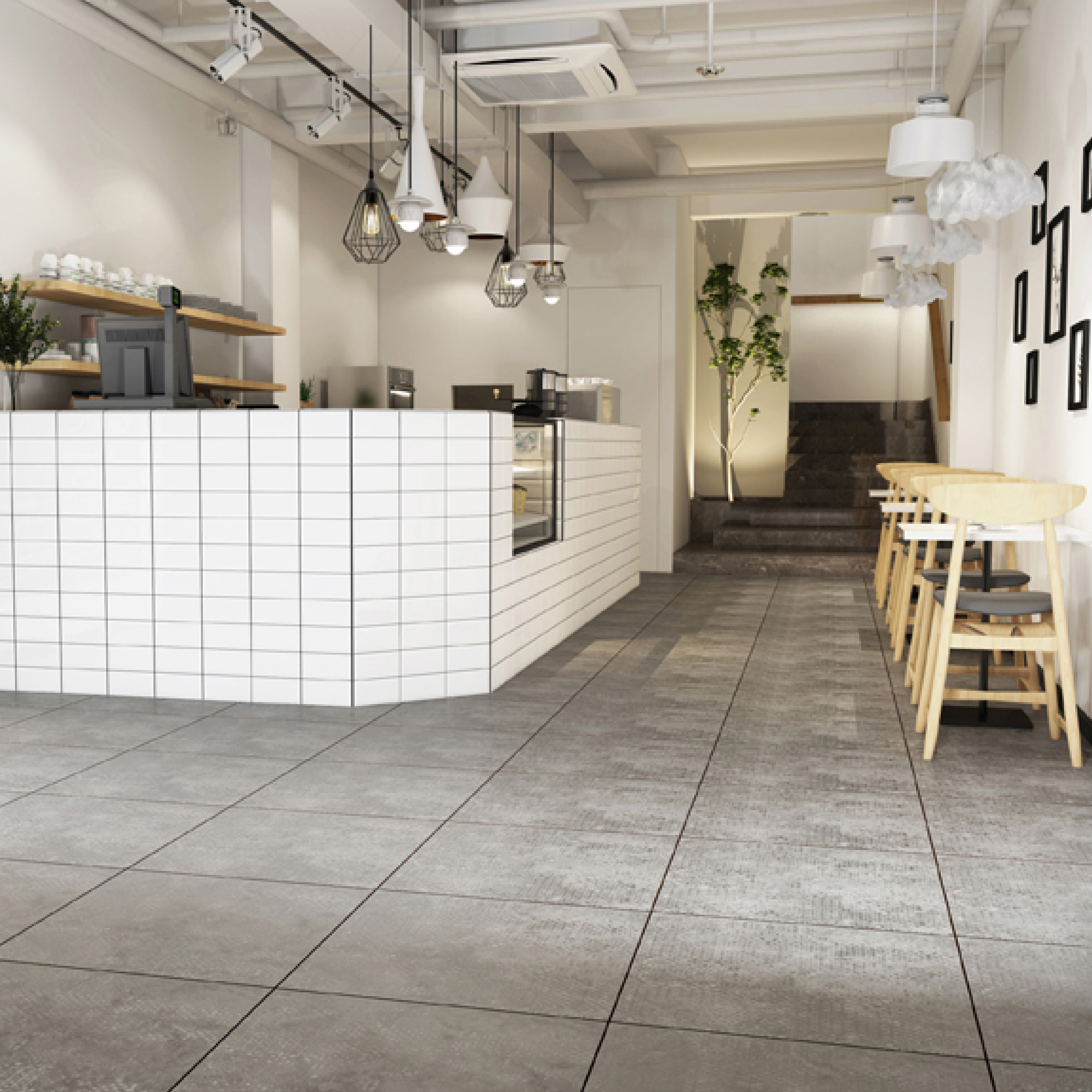These 600x600mm ceramic tiles feature a grey concrete - look design, perfect for café and commercial decor. With a matte finish mimicking concrete texture, they bring an industrial - minimalist vibe, adding a sleek, durable flooring solution that enhances the modern, understated aesthetic of spaces like cafes.