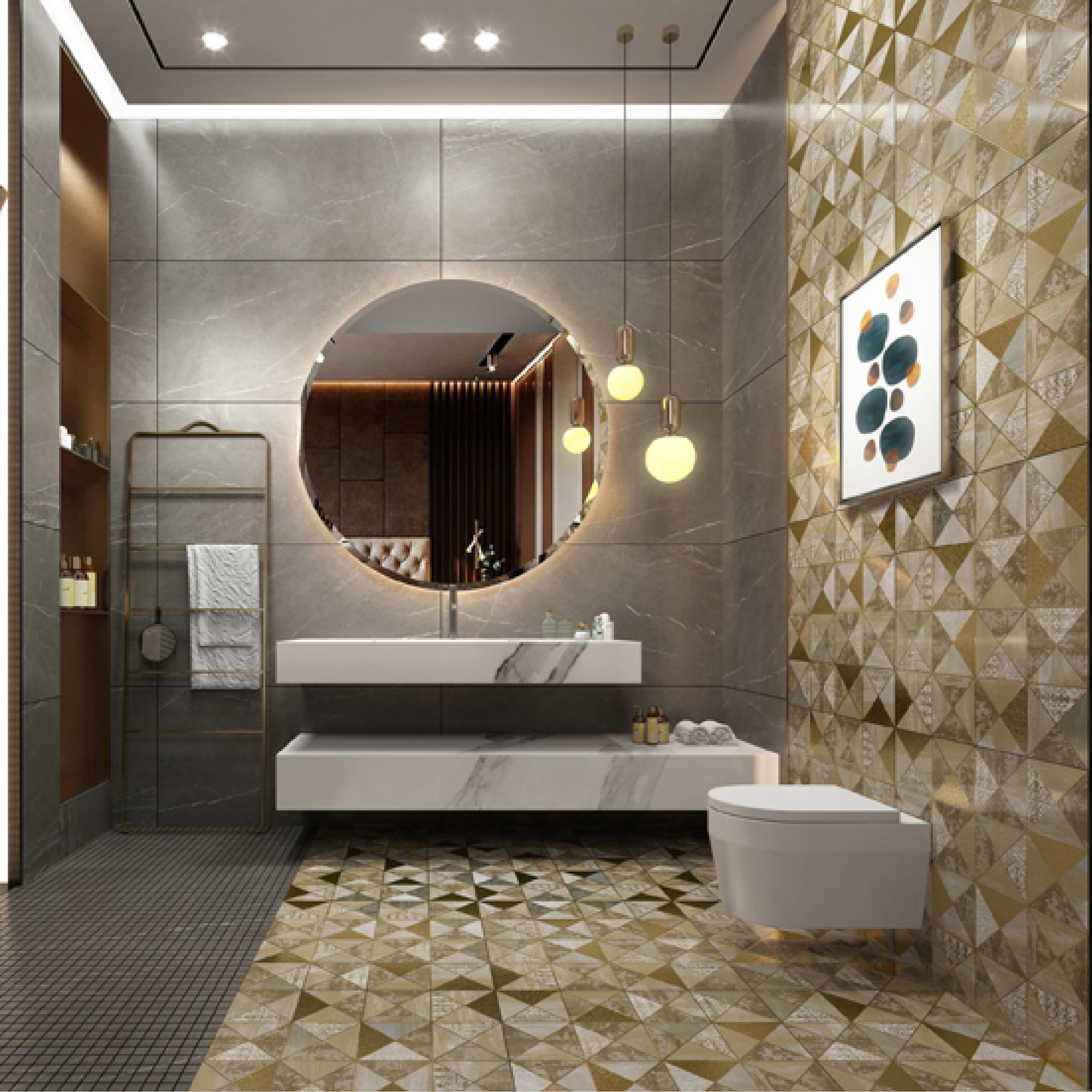 The dynamic triangular geometric design, featuring a mix of green, yellow, grey, and white hues, adds a modern and artistic touch to the space. Whether used on the floor or as an accent wall, they create a visually appealing and lively atmosphere, transforming the dining area into a stylish and inviting place for gatherings and meals.