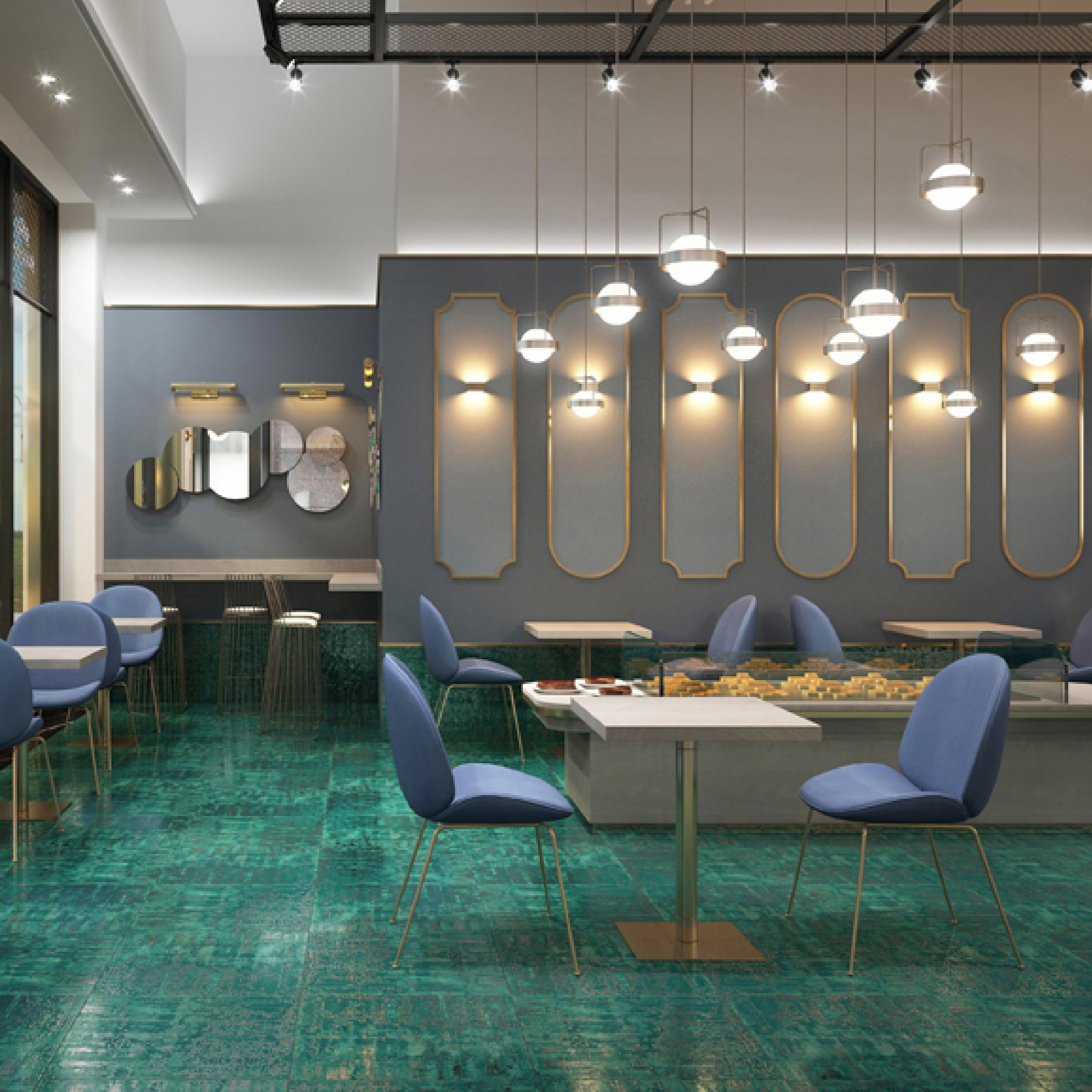 Ideal for bathroom decor, the grey - inlaid designs on the teal base create a visually striking, modern - luxury ambiance. Whether used on floors or feature walls, they infuse the space with artistry and sophistication, transforming your bathroom into an elegant retreat with their distinctive, eye - catching appearance.