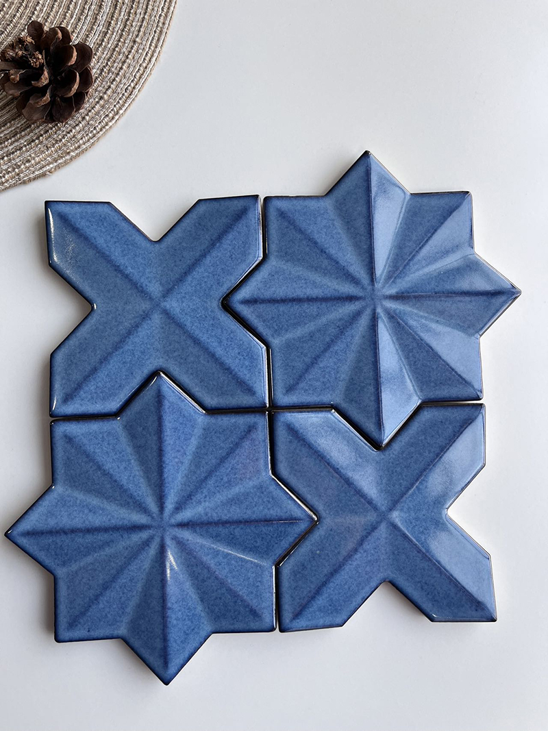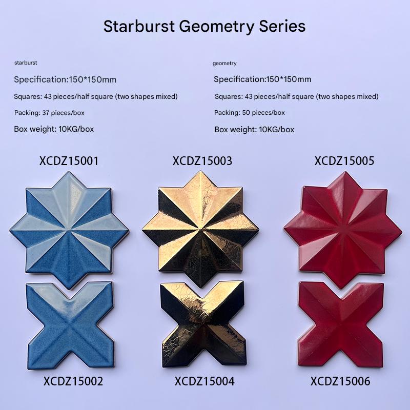 Unleash creativity in your space with our 150x150mm Artisan Star - Geometric Mosaic Tiles (XCDZ15001 - XCDZ15006), part of the Star - Geometric Series. These handcrafted tiles blend star and geometric shapes, offering a playful yet sophisticated mix of blue, gold, and red finishes to spark unique design ideas.