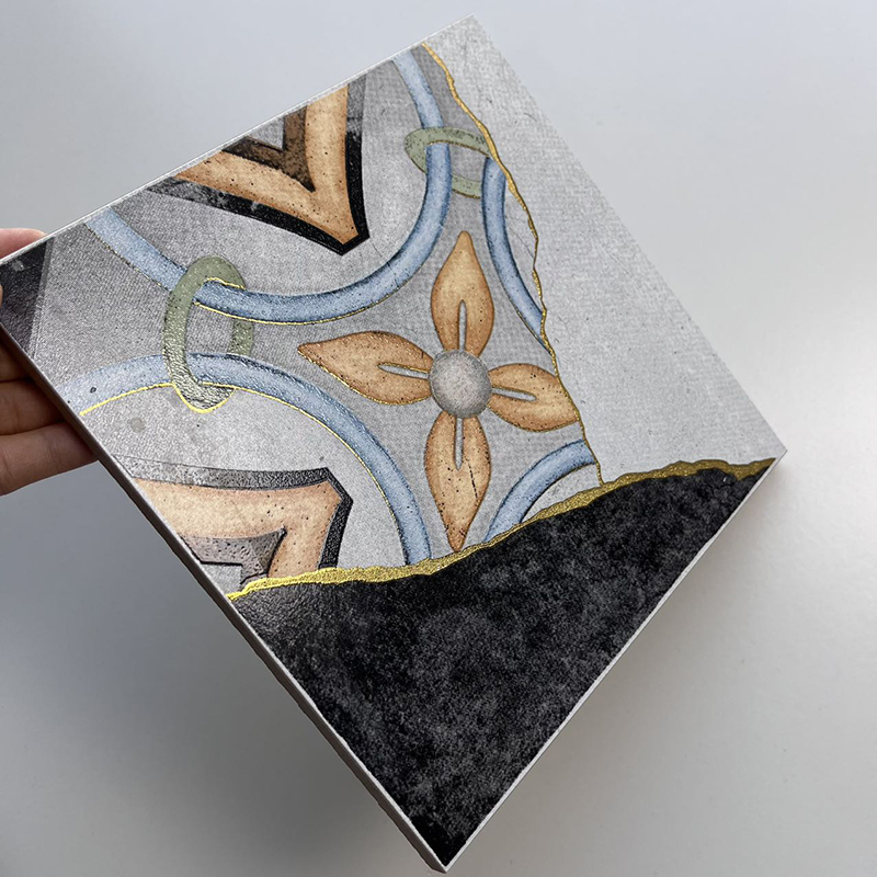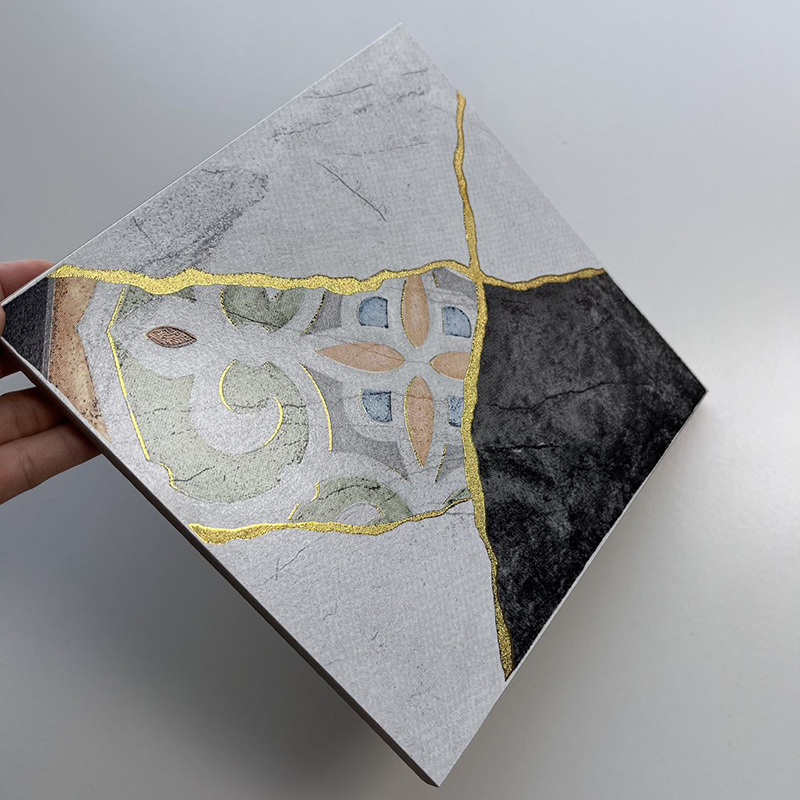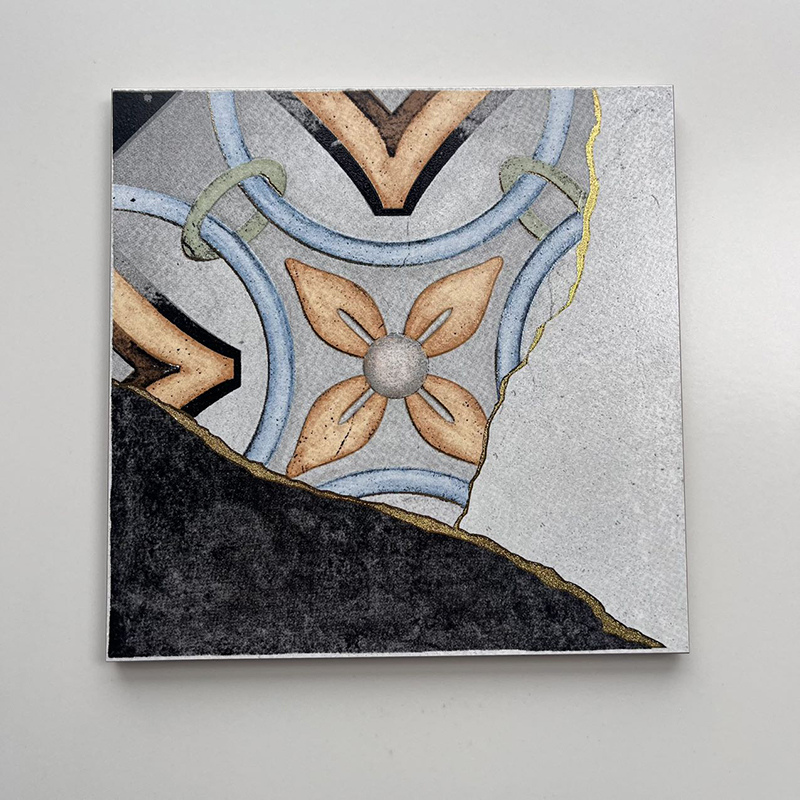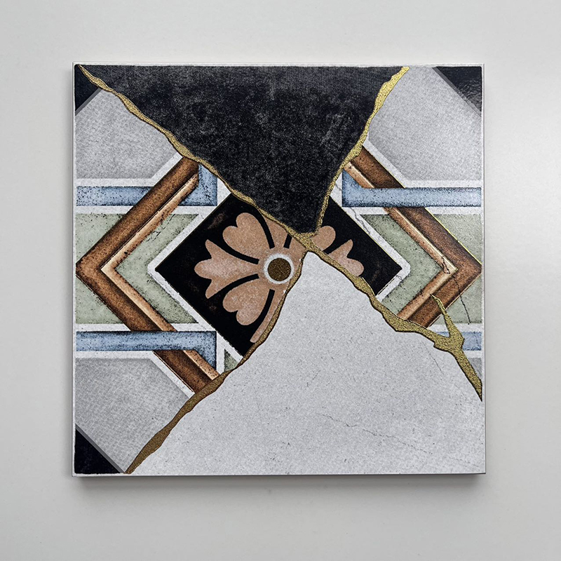 Redefine your space with the bold artistry of our 200x200mm Artistic Patchwork Gilded Ceramic Tiles, model XC202536. As a standout in the Gilded Tile Series, these tiles blend eclectic patchwork design with luxurious gilded details. Each tile showcases a fragmented, artistic layout—combining diverse colorful patterns, textured neutrals, and striking gold lines that mimic the elegance of kintsugi (the art of repairing with gold).