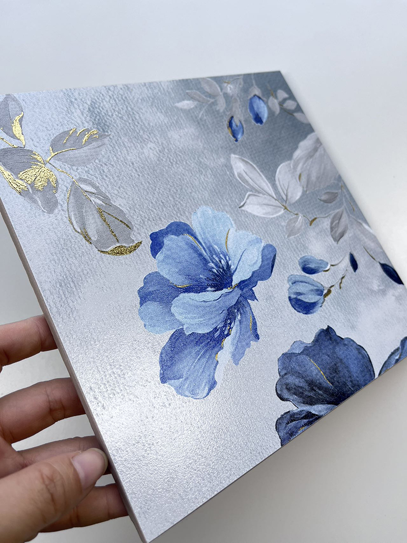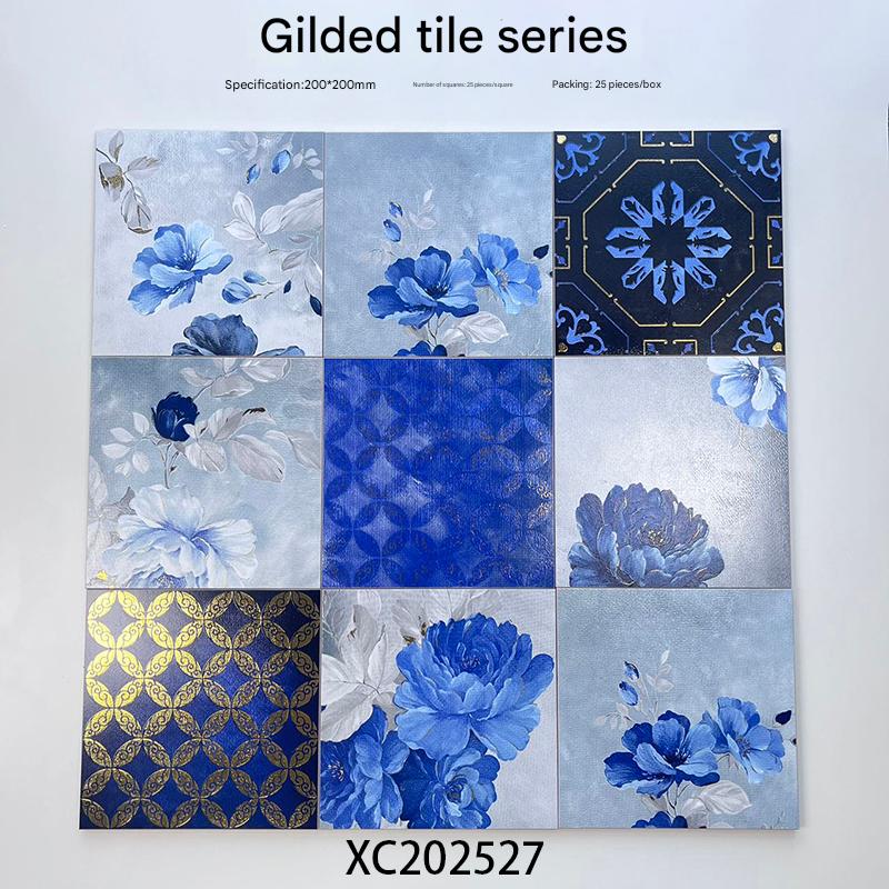 Infuse your space with artistic elegance using our 200x200mm Blue - Themed Floral & Geometric Gilded Ceramic Tiles, model XC202527. As a standout in the Gilded Tile Series, these tiles blend delicate blue florals with bold geometric patterns, all elevated by subtle gold gilded details that catch the light.