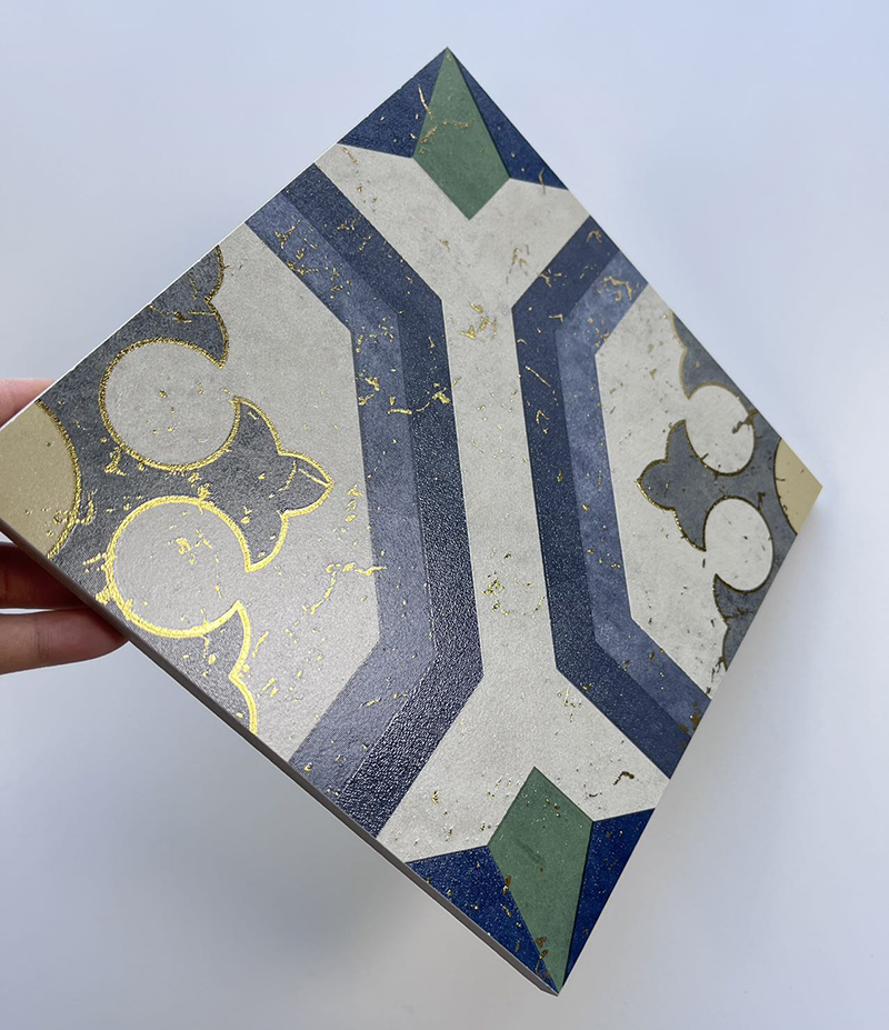 Step into a world of timeless elegance with our 200x200mm Geometric Mosaic Gilded Ceramic Tiles, model XC202845. As a standout in the Gilded Tile Series, these tiles blend classic mosaic artistry with a touch of luxury. The intricate geometric pattern, adorned with a harmonious palette of blue, green, gray, and beige, is elevated by subtle gilded accents that catch the light and add a hint of opulence.
