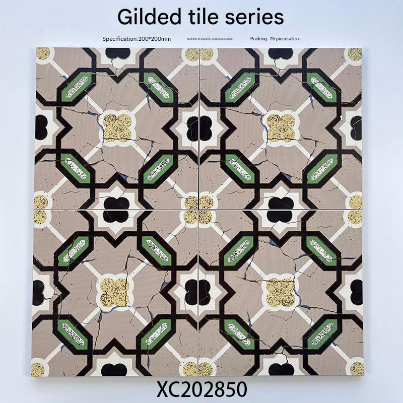 Transform your space with the timeless elegance of our 200x200mm Vintage Geometric Gilded Ceramic Tiles, model XC202850. As part of the exclusive Gilded Tile Series, these tiles blend classic design with modern craftsmanship. The intricate geometric patterns, rendered in a sophisticated palette of beige, black, and green, are elevated by delicate gold gilded accents that catch the light and add a touch of luxury.
