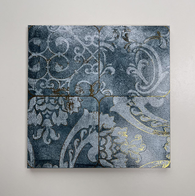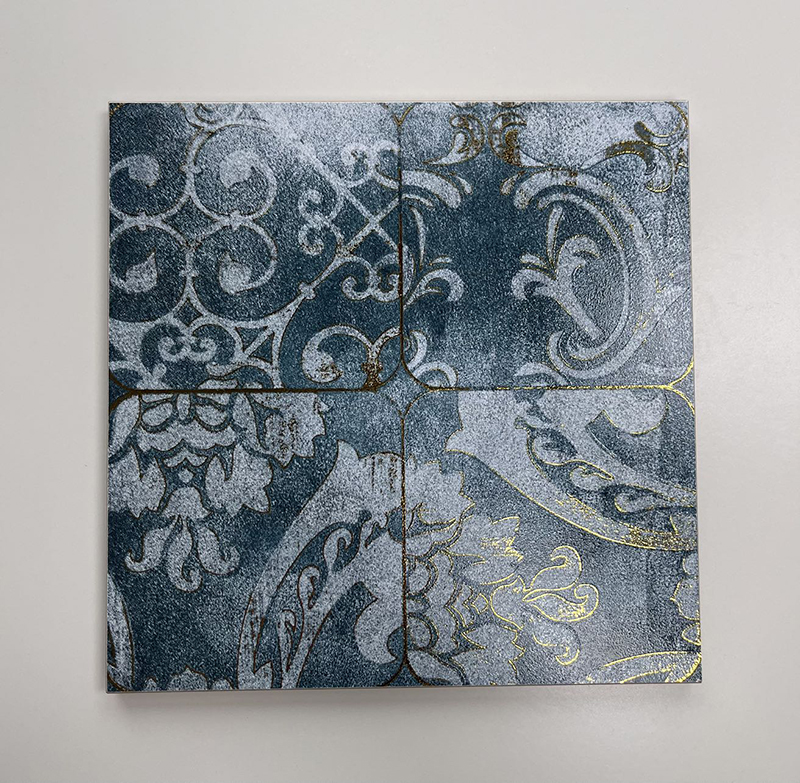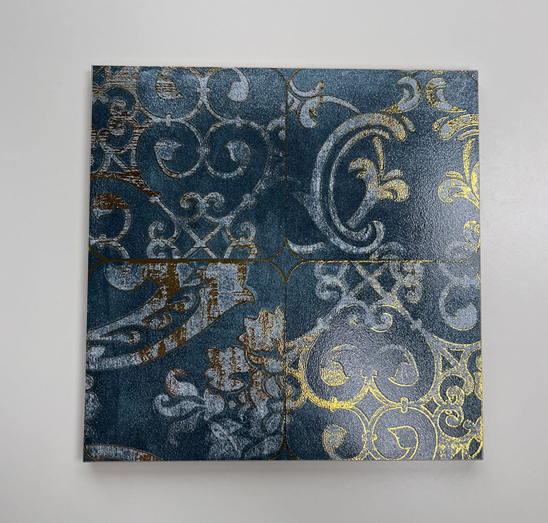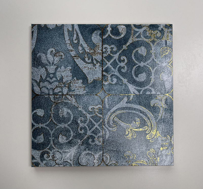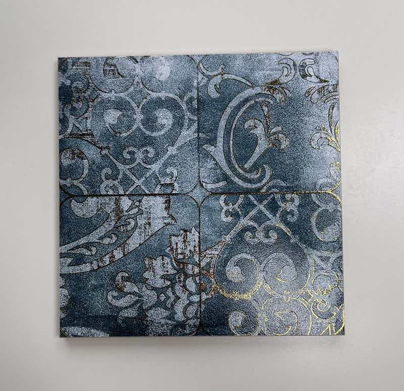 Transport your space to an era of refined elegance with our 200x200mm Vintage - Style Gilded Floral Ceramic Tiles, model XC202540. As a centerpiece of the Gilded Tile Series, these tiles blend classic floral artistry with a touch of opulence. The deep blue backdrop serves as a canvas for intricate gold floral patterns, while the distressed finish evokes the timeless beauty of aged, handcrafted mosaics.