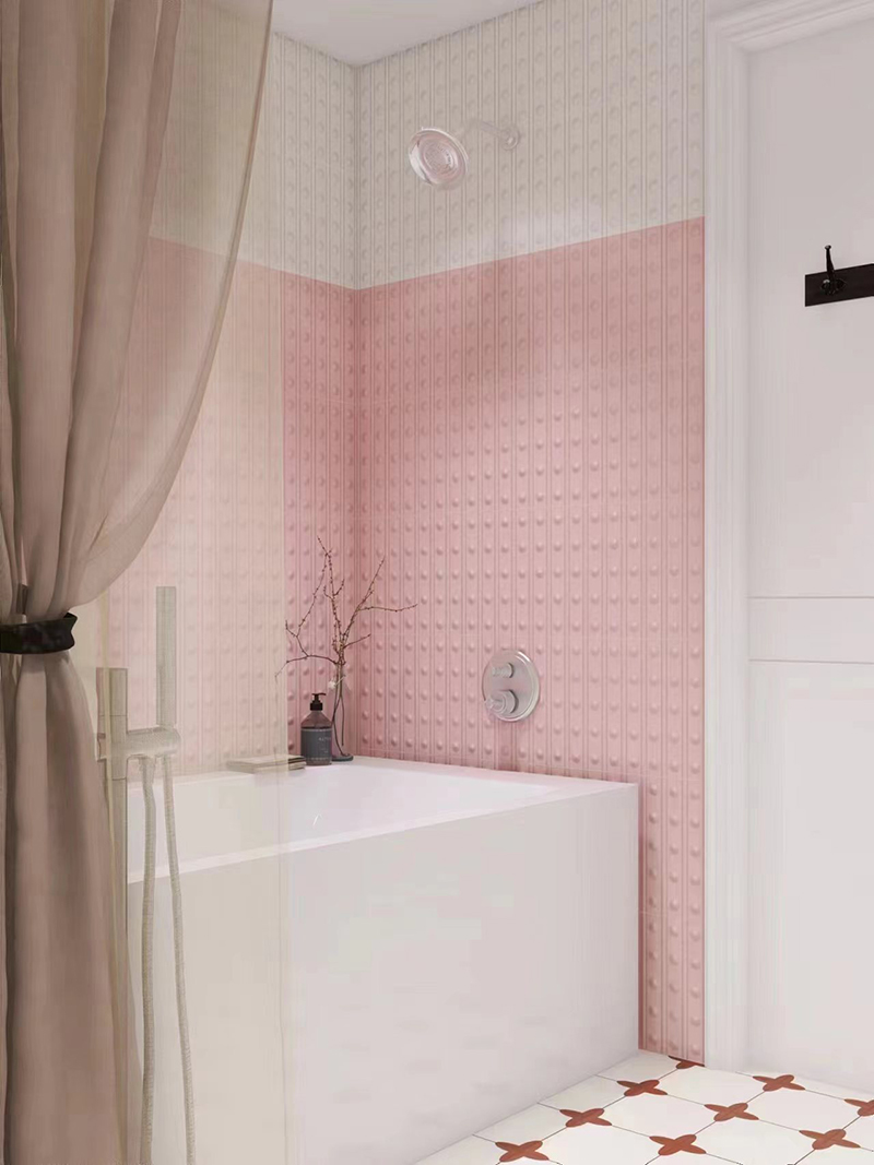 Transform your living spaces with our 50x300mm Soft - Light Pink Dotted Ceramic Wall Tiles, model XC503005. The soft - light pink hue exudes a warm, romantic ambiance, like a subtle blush in a cozy morning. The evenly spaced dotted pattern adds unique tactile and visual allure, turning ordinary walls into artistic focal points.