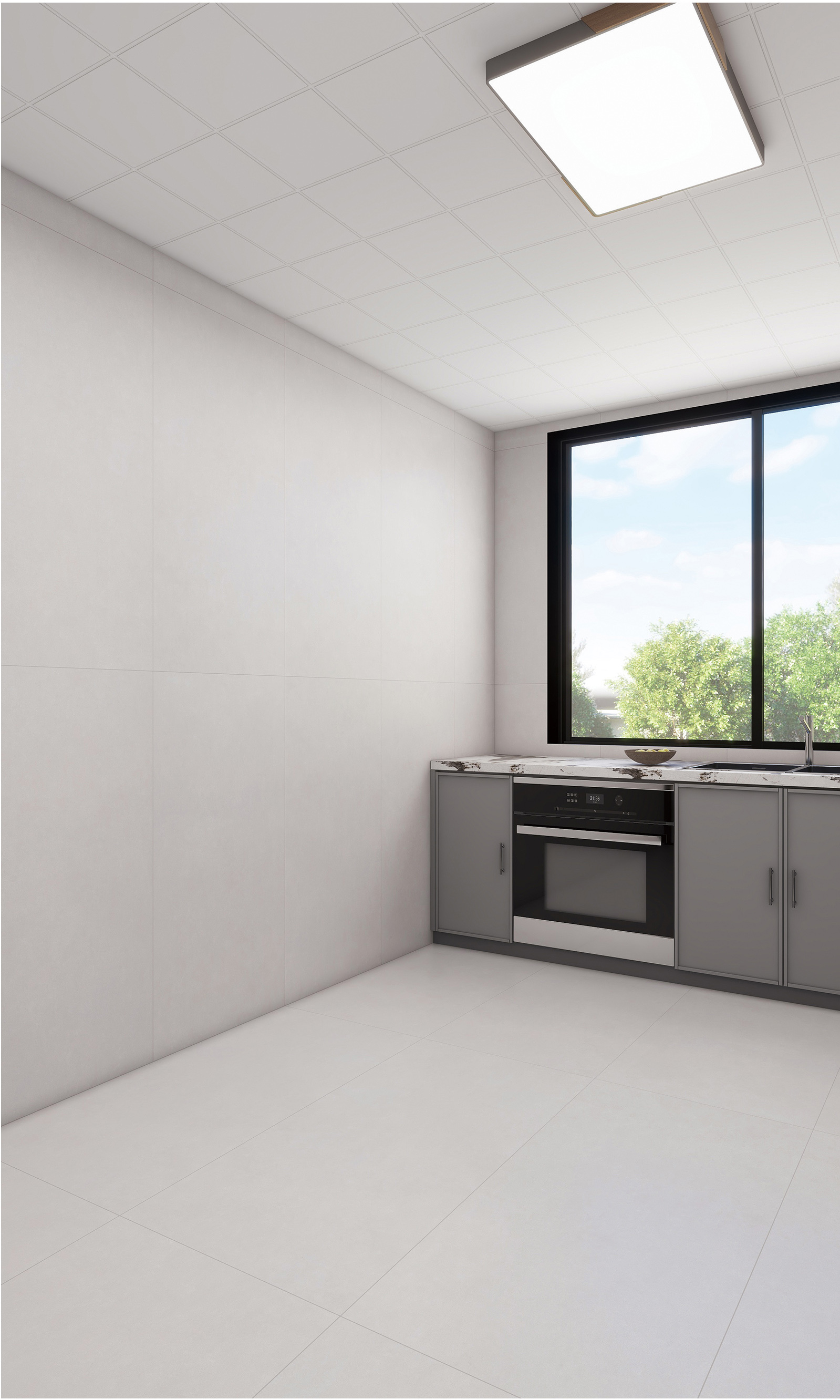 These 60x120 cm ceramic tiles feature a matt finish and a light grey hue. Perfect for living rooms, they bring a calm, understated elegance, complementing various furniture styles. In kitchens, their matt surface offers a sleek look while being easy to clean, resisting stains and wear.