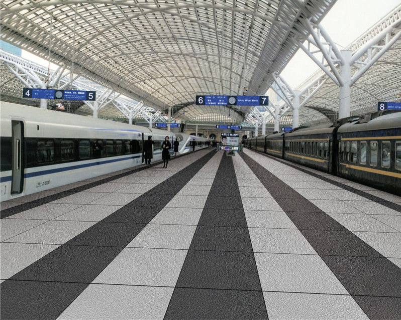 These ceramic tiles, with sizes 600x600x10mm, 300x600x10mm, 300x300x10mm, feature a textured finish, charcoal grey color, and ecological paving stone style, ideal for crafting durable, visually striking surfaces in transport hubs and public spaces.