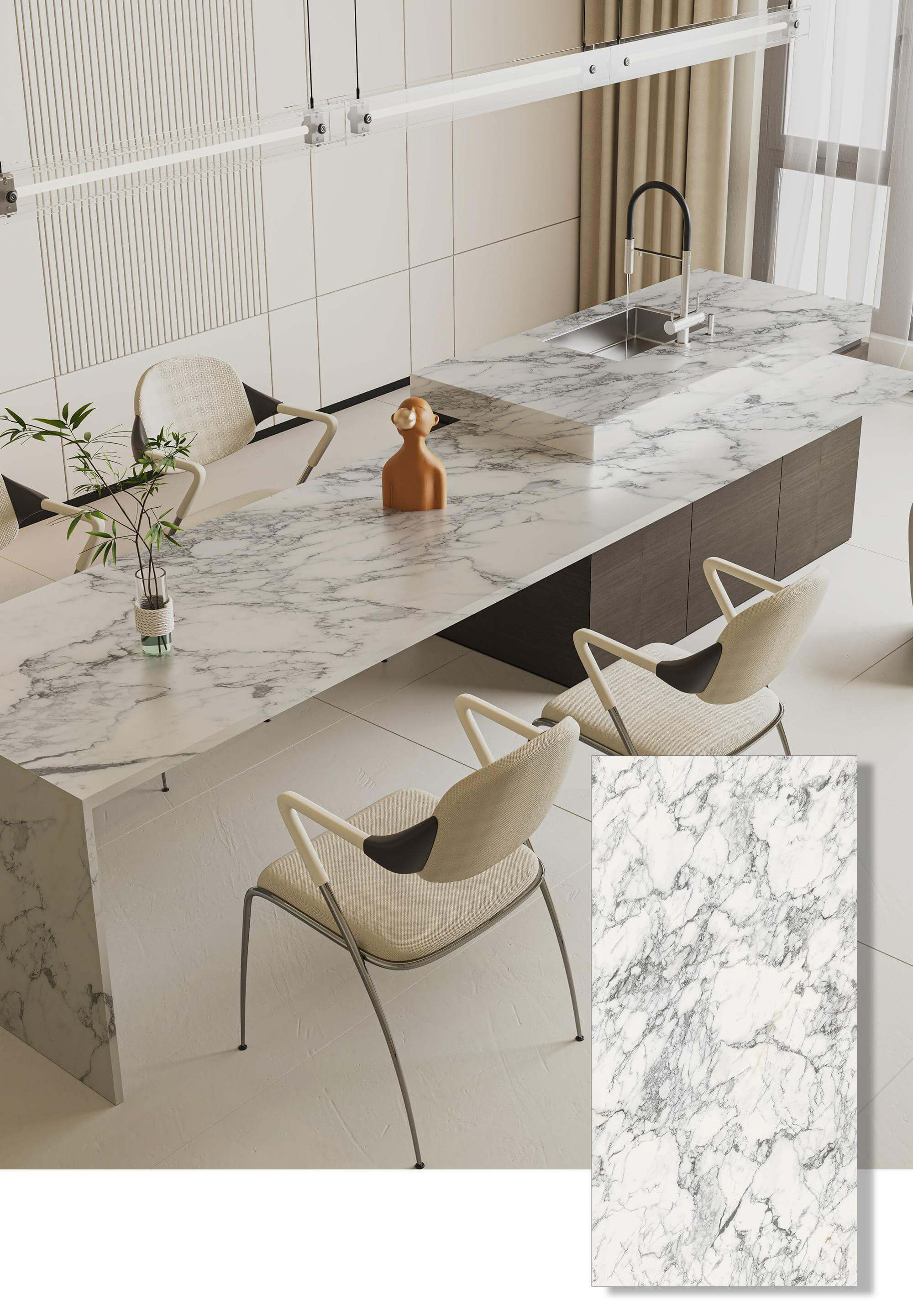 Using advanced replica glaze technology and full-body through-color body, this sintered tile delivers a high-gloss, natural stone appearance with exceptional durability. It offers superior resistance to scratches, stains, heat, and moisture, making it ideal for a wide range of applications—from sleek workspace countertops and movable furniture to bathroom vanities, custom interior surfaces, and even outdoor cladding.
