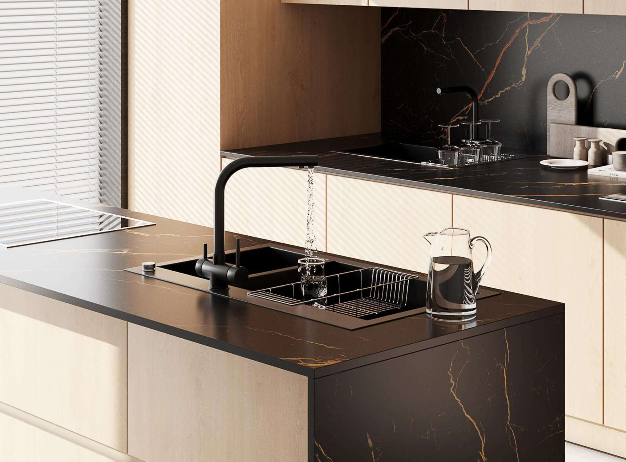 The single-page continuous vein pattern enables seamless installation across expansive countertops and walls, creating a cohesive, uninterrupted visual flow that transforms any space. This Nero Portoro sintered tile is highly versatile, ideal for kitchen islands, statement backsplashes, bathroom vanities, flooring, and outdoor cladding. Its bold black-and-gold contrast acts as a timeless design anchor, complementing both minimalist and modern decor styles with ease.