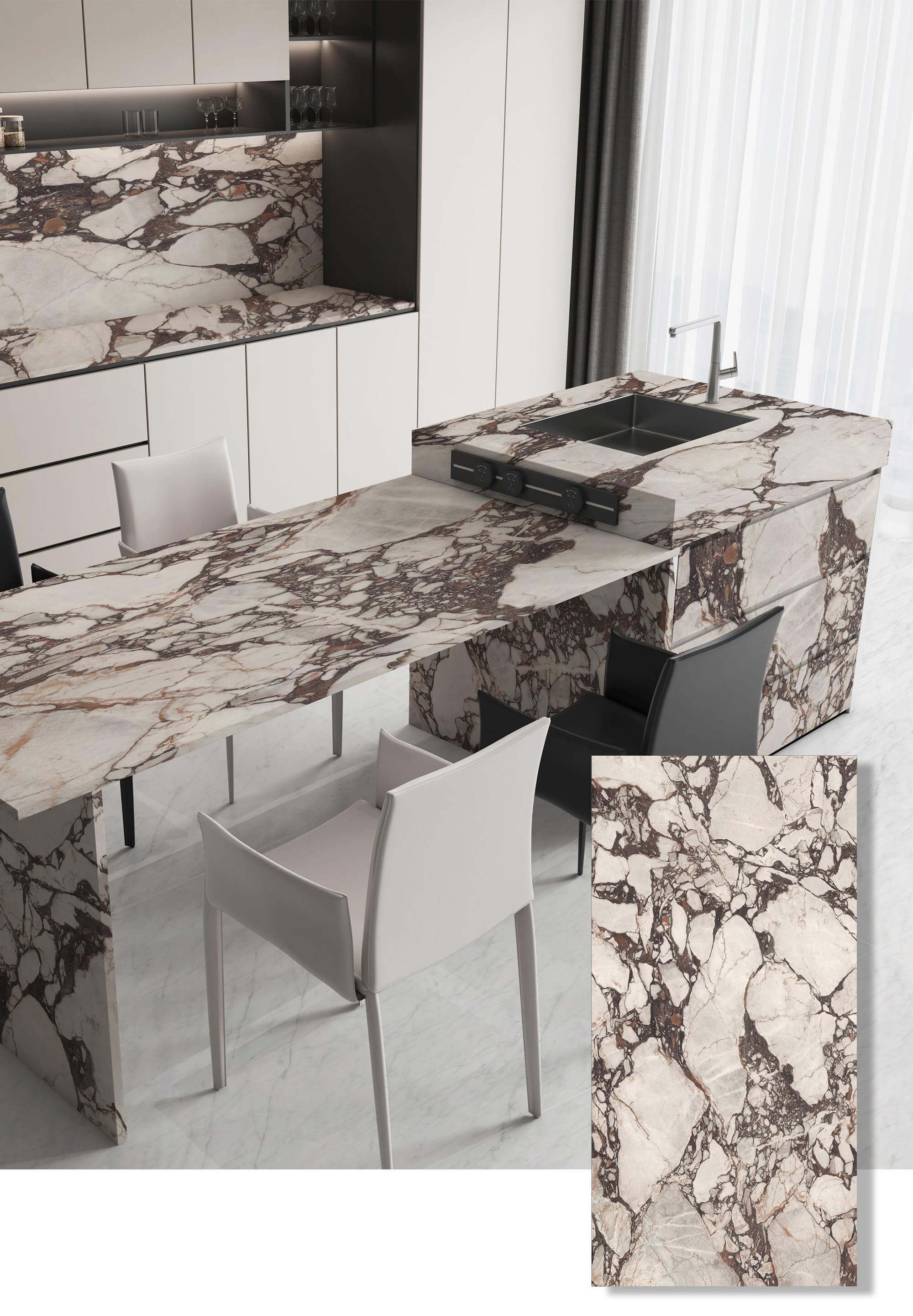 The large-format design allows for seamless installations that minimize joints and amplify the slab’s dramatic, marble-like visual impact. Whether used in a luxury kitchen or a high-end commercial space, the Boutique Bvlgari Purple series brings the timeless allure of natural Bvlgari marble to your projects—without the fragility and high maintenance of real stone. It’s the perfect choice for designers and homeowners seeking a durable, versatile, and sophisticated material that elevates any space with iconic luxury.