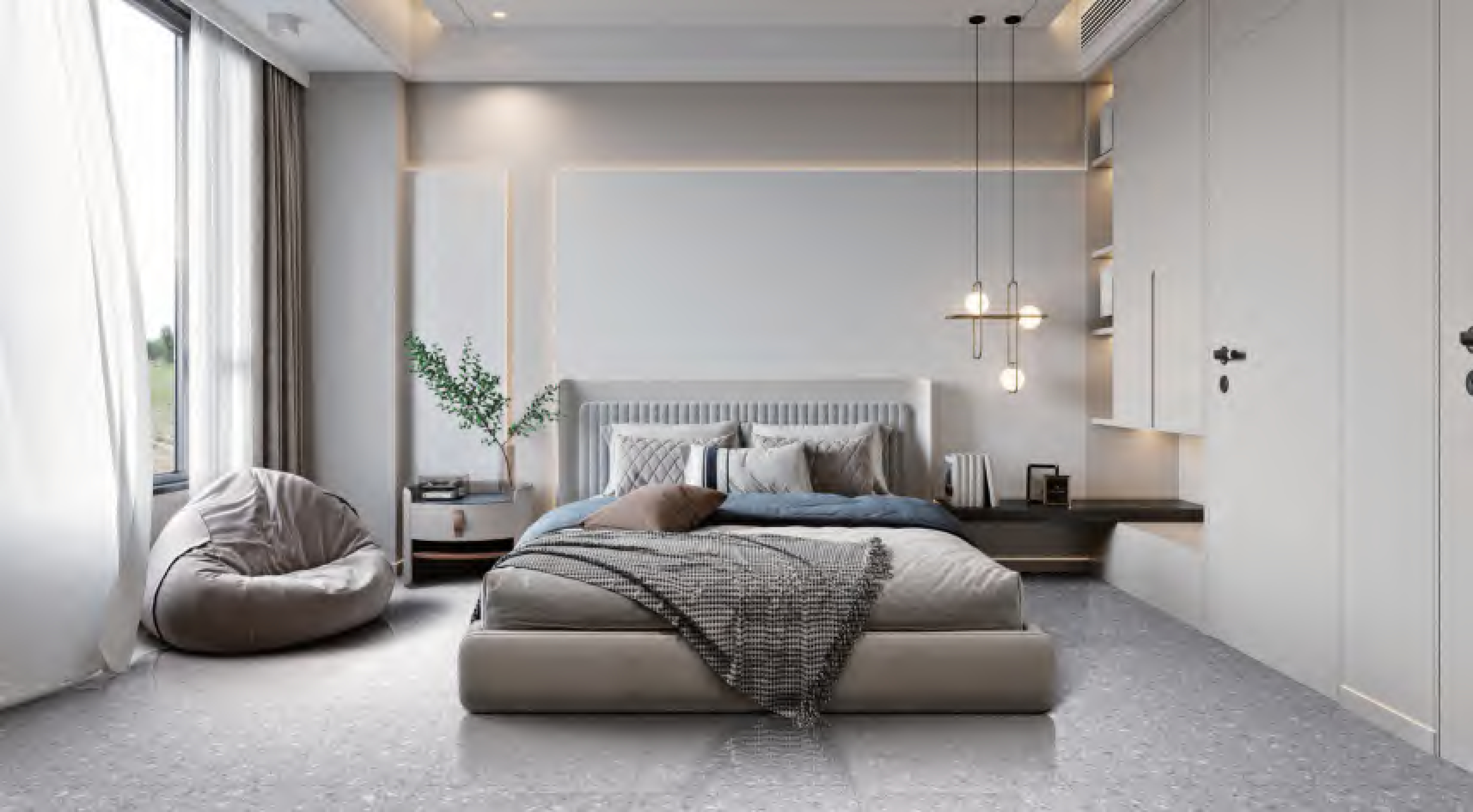 When used on bedroom floors, the matt finish brings a cozy, understated charm, creating a relaxed atmosphere, while the polished finish adds a touch of gloss and elegance, enhancing the room's brightness. The grey terrazzo pattern adds a unique texture, perfectly complementing various bedroom decor styles and making the space both comfortable and stylish.