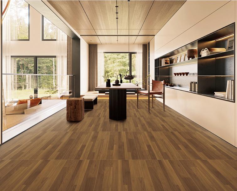 The herringbone pattern, combined with a warm brown wood tone and a matte finish, mimics the texture of real wood, creating a cozy and sophisticated atmosphere. Made of durable ceramic, it offers the beauty of wood with the practicality of easy maintenance.