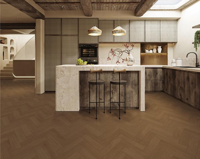 The herringbone pattern, combined with a matte finish, replicates the texture of natural wood, creating an inviting and sophisticated atmosphere. Crafted from durable ceramic, it offers the aesthetic charm of wood while being easy to clean and maintain.
